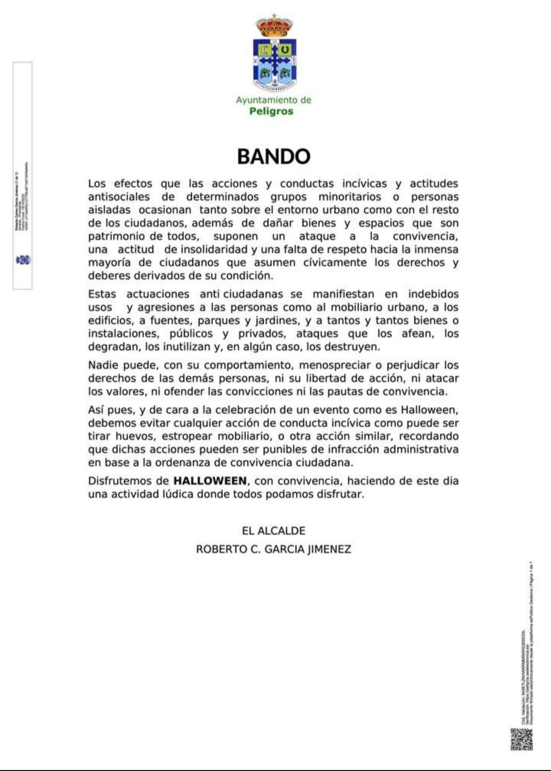 El Ayuntamiento de Peligros ha publicado un bando municipal con motivo de la celebración de Halloween, en el que el alcalde, Roberto C. García Jiménez, apela a la responsabilidad ciudadana y a la convivencia durante esta jornada festiva.